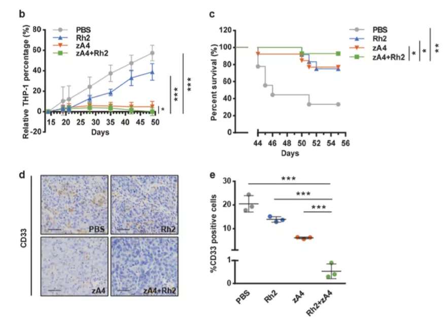 然而总有一些原代AML细胞TRAIL表达量很低,影响zA4的效果。联系之前的研究,人参皂苷Rh2能够诱导白血病细胞死亡受体表达和细胞毒性,研究者就试图通过Rh2增强TRAIL诱导的细胞死亡。通过IC50测定、信号通路分析证实了存在协同效应,在细胞、小鼠水平上都得到了证实,两者联合使用促进白血病肿瘤的凋亡。