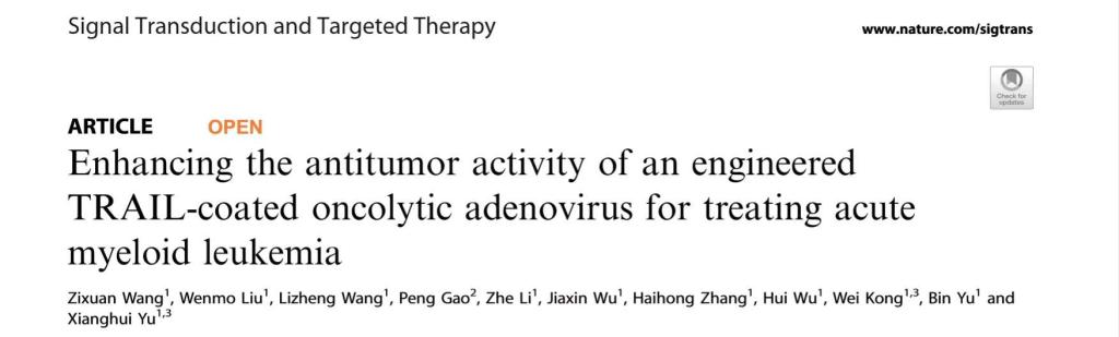 于湘晖教授课题组在国内主办的SCI杂志Signal Transduction and Targeted Therapy上发表文章,题为“ Enhancing the antitumor activity of an engineered TRAIL-coated oncolytic adenovirus for treating acute myeloid leukemia ”,该研究构建了一种表达TRAIL融合蛋白的溶瘤腺病毒,和人参皂苷Rh2联用,实现了选择性杀伤血液肿瘤,为白血病的治疗提供了新的思路。