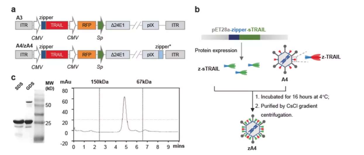 团队为构建溶瘤腺病毒,通过将腺病毒A3衣壳蛋白IX插入“拉链结构”,使得TRAIL能够与“拉链结构”偶联展示在衣壳蛋白表面。由于只有约17%的衣壳蛋白连接上了TRAIL,研究者试图采用新的策略:在大肠杆菌中表达可溶性TRAIL-“拉链结构”融合蛋白,再将可溶性的蛋白与病毒粒子孵育,离心后分离表面覆盖可溶性TRAIL的腺病毒粒子。通过变性凝胶电泳、高效液相色谱、斑点杂交等证实了改造的腺病毒zA4载有活性更高的TRAIL。细胞实验也证明zA4相较于原来的版本A3、A4侵染能力、特异性显著提高。细胞结合试验用于评估侵染活性,证明了携带TRAIL显著促进了腺病毒的内吞;定量PCR试验用于评估病毒复制能力,zA4在癌细胞中复制显著强于其他载体。