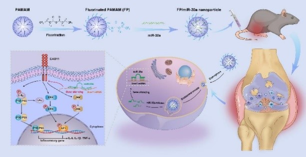 吉林大学分子酶学工程教育部重点实验室李全顺/韩浩博团队,在基于miR-23b递送抗类风湿性关节炎研究的基础上(Nat. Commun. 2023, 14: 944),挖掘了一类与炎症发生发展密切相关的miRNA—miR-30a,其通过靶向Snai1基因进而调节Cad11表达,抑制NF-κB和MAPK信号通路,实现类风湿性关节炎的精准治疗;以氟化聚酰胺-胺树枝状聚合物为载体,实现了miR-30a的体内稳定递送,动物水平取得了良好的抗炎效果,为类风湿性关节炎及其他自身免疫性疾病的基因治疗研究提供了新的思路。相关研究“Fluorinated dendrimer-mediated miR-30a delivery regulates the inflammation of macrophages and mitigates the symptoms of rheumatoid arthritis”发表于国际学术期刊Journal of Controlled Release(1区,影响因子10.5)。论文第一完成单位为糖果派对-糖果派对试玩