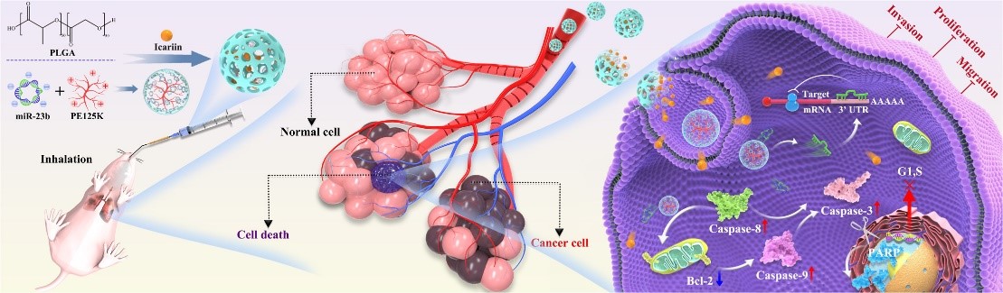 同时,miR-23b除具有抗炎功能外,其能够抑制细胞增殖,在肿瘤基因治疗研究中具有广阔的前景。研究团队针对肺癌传统治疗手段靶向性差及副作用大等缺陷,构建了以PLGA为基质的多孔微球体系,该体系实现了淫羊藿苷与miR-23b的担载,基于吸入式策略实现了药物与治疗基因在肺部的靶向沉积和持续释放,有效诱导肺癌细胞凋亡并抑制肿瘤转移,为肺癌的药物与基因联合治疗提供了一条局部给药新策略。相关研究“Porous PLGA microspheres for the inhalation delivery of icariin and miR-23b in the treatment of metastatic lung cancer”发表于国际学术期刊Asian Journal of Pharmaceutical Sciences(1区,影响因子10.7)。论文第一完成单位为糖果派对-糖果派对试玩