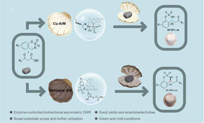 该研究报道了一种酶控双向对映选择性催化策略,用于不对称脱羧曼尼希反应(DMR)合成手性β-磺酰胺酮。研究通过构建铜人工金属酶(Cu-ArM)和利用商业脂肪酶Novozym 435,分别实现对R和S构型产物的高选择性合成。Cu-ArM由生物素化铜复合物与链霉亲和素(WT-Sav)组装而成,催化环状磺酰胺与β-酮酯反应生成R构型产物;而Novozym 435通过其催化三元活性中心调控反应路径,高效获得S构型产物。分子动力学模拟揭示了酶-底物相互作用机制,阐明环状亚胺因稳定氢键网络和紧凑构象而优于非环状底物的原因。该方法在温和水相条件下实现低催化剂负载(Cu-ArM仅0.5 mol%),并成功应用于克级合成及药物分子衍生物制备(如降压抗炎活性分子chroman-4-amine)。该工作为绿色合成手性含氮药物分子提供了新范例,拓展了生物催化在不对称合成中的应用潜力。论文第一完成单位为糖果派对-糖果派对试玩