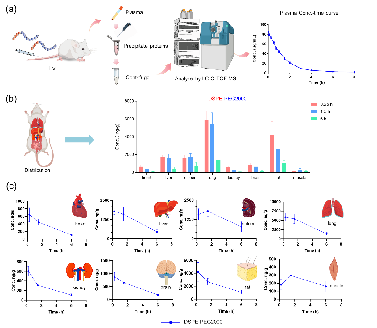 研究证实,DSPE-PEG2000可快速消除,特异性分布于肺、肝、脾;可激活补体系统与炎症因子应答,但不诱发适应性免疫抗体、无明显组织损伤;体内经酯酶水解后,PEG2000经肾脏排泄且以主链随机裂解方式降解。