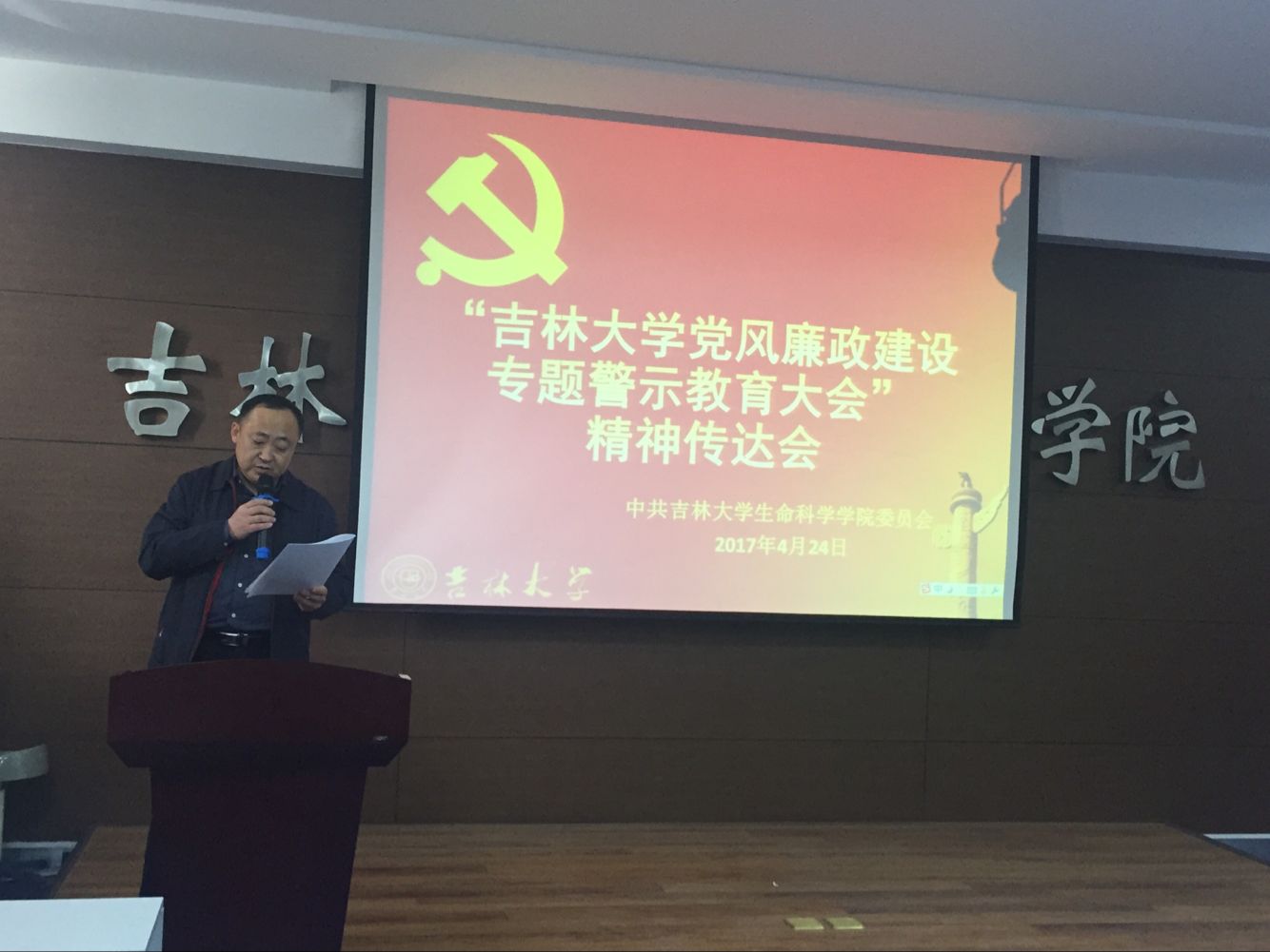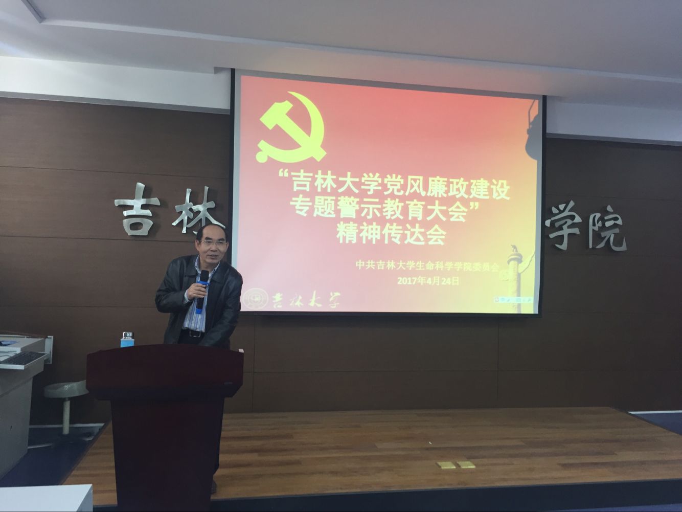 在生命科学楼107室召开教职工大会,传达学校党风廉政建设专题警示教育大会精神。会议由学院党委书记李佰志主持。