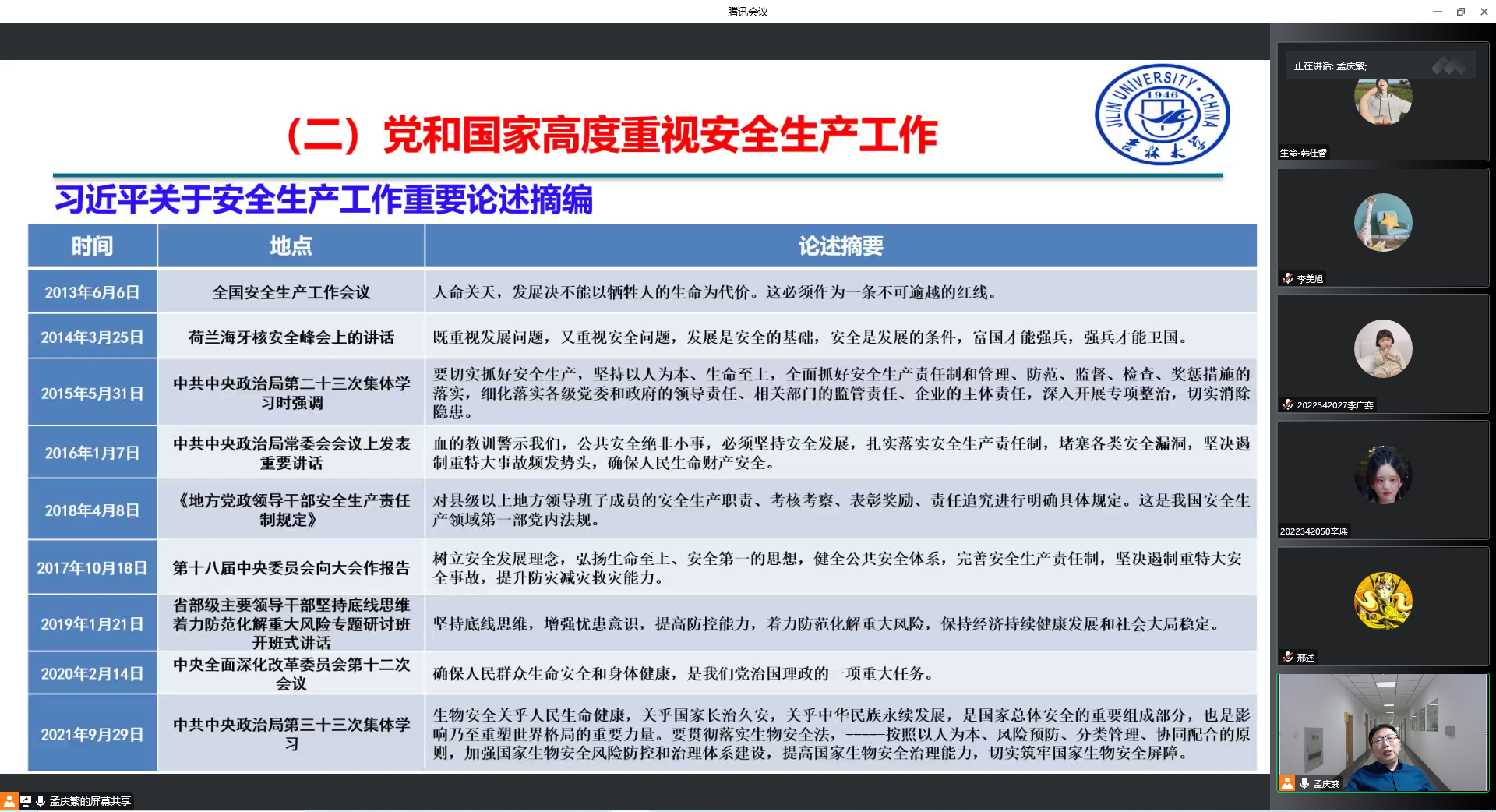 课上,吉林大学国家级生物实验教学示范中心副主任孟庆繁以《生物实验室安全面临的主要问题与应对策略》为主题为学院研究生做专题讲座,以中外高校实验室的事故案例为切入点,分析实验室常见安全隐患及其危害,就如何提升实验安全意识,规范实验安全行为,排查实验室安全隐患,防范实验室安全事故等方面提出了一系列工作建议。同时,讲解了危险化学品的基础知识、使用防护和安全管理等方面的要求。邢述在课程总结中表示,研究生必须树立“隐患就是事故,安全零容忍”的观念,切实做到 “敬畏安全”“我要安全”“我会安全”。