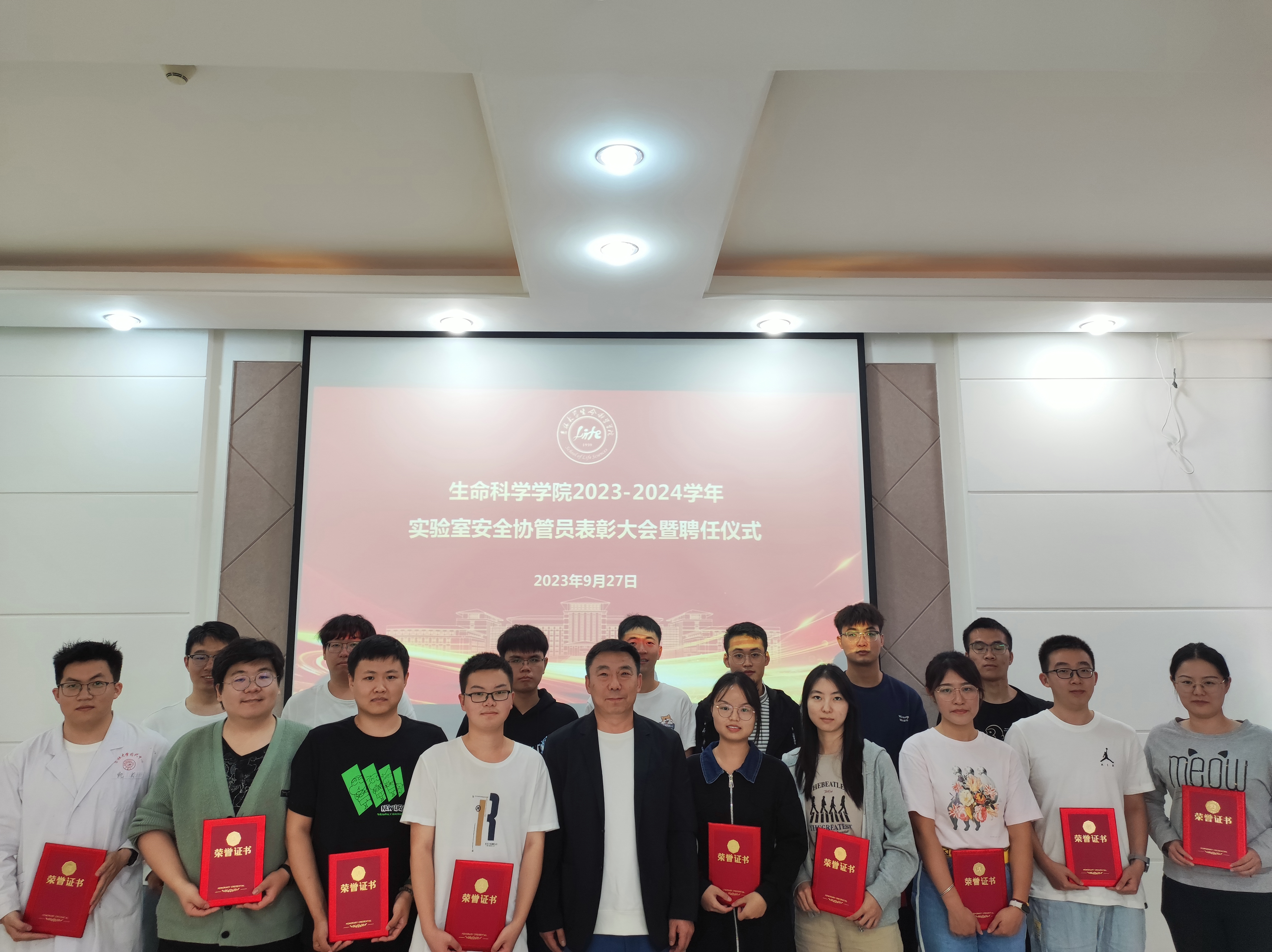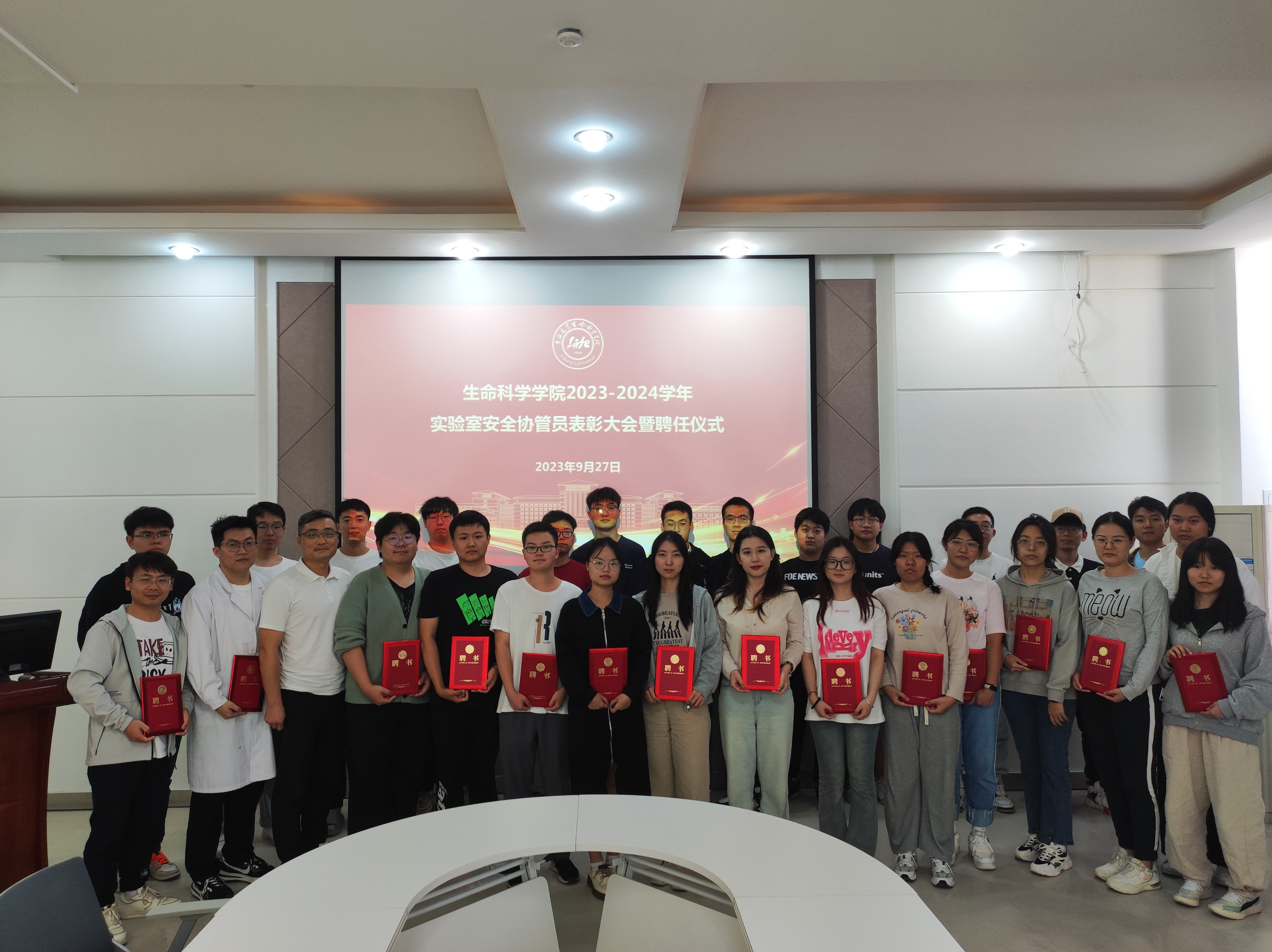 于生命科学楼408室举行2023-2034学年实验室安全协管员表彰大会暨聘任仪式。党委副书记林相友、学院实验室安全管理工作小组成员和各实验室安全协管员参会。表彰大会由副院长崔帅主持。