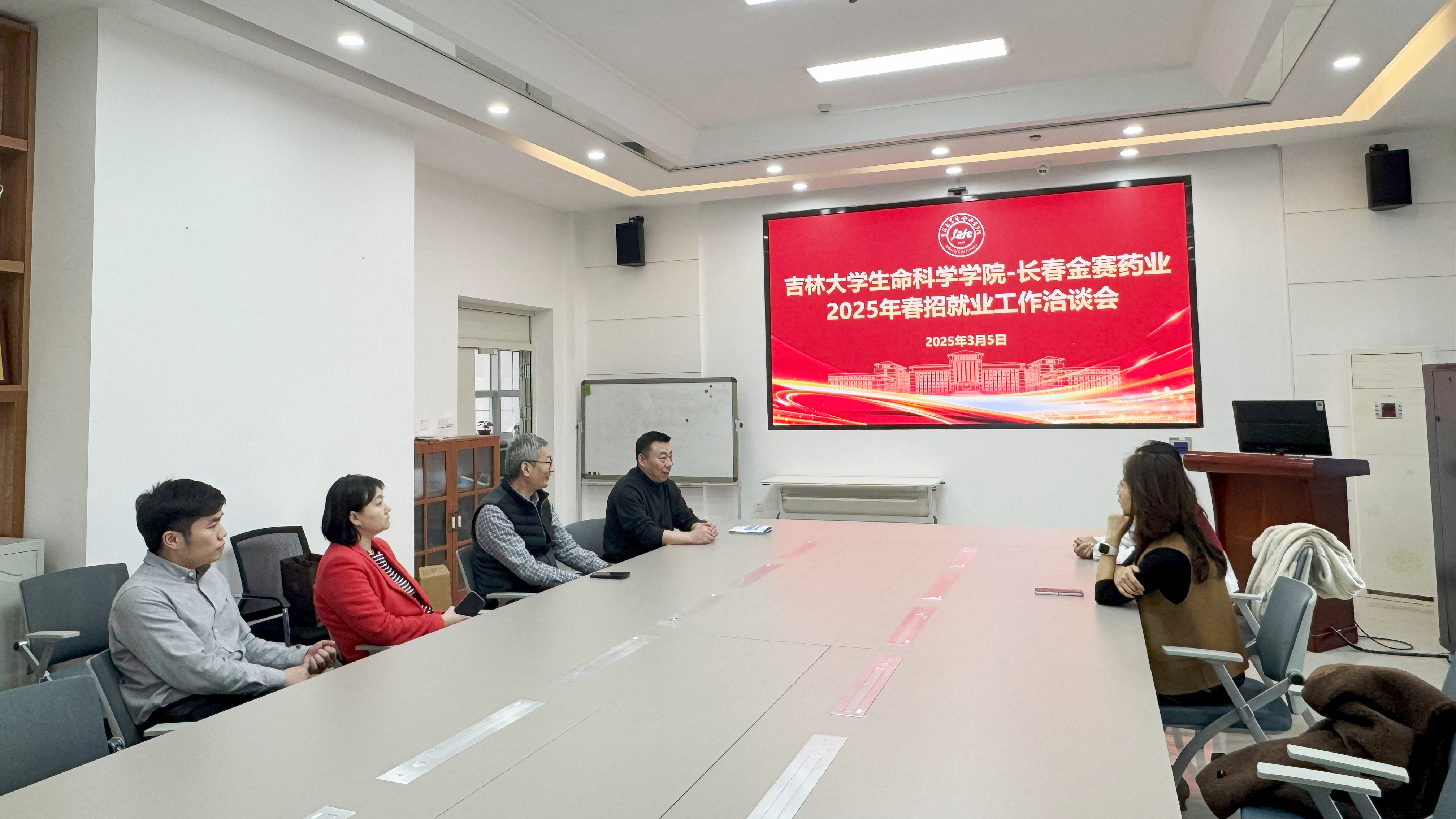 与长春金赛药业有限责任公司举办2025年春季校园招聘就业工作洽谈会,学院党委副书记林相友、副院长高仁钧、长春金赛药业人力资源负责人赵嘉琦等参加洽谈会。