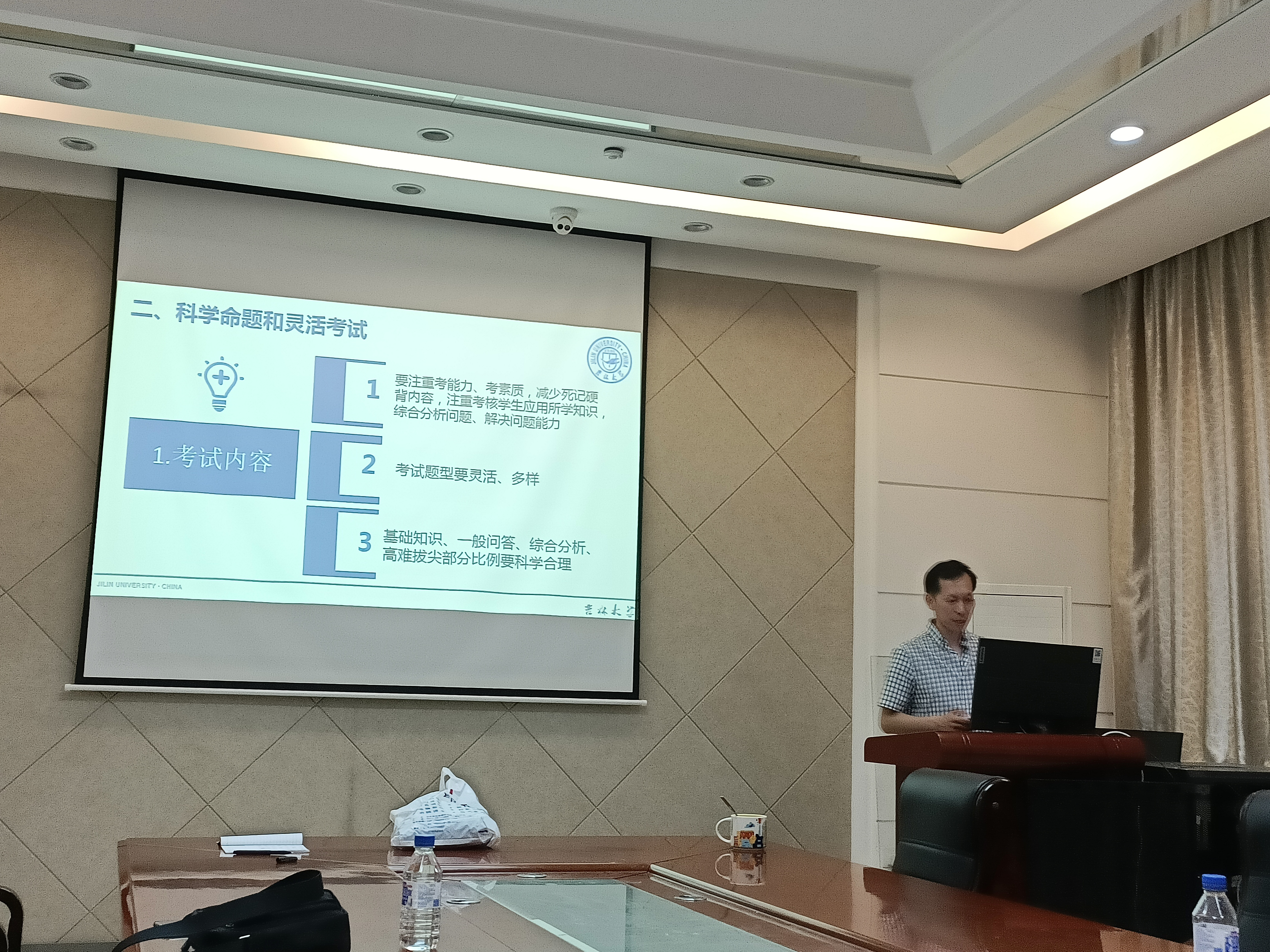 学院教学办公室主任刘成柏首先以新修订的《吉林大学本科课程考核管理办法》(校教字﹝2020﹞123号)为指导,从考前工作布置及教育动员、科学命题和灵活考试、考务组织安排、考风考纪、阅卷工作等五个环节,对考试相关工作做了详细、具体的讲解,并对考试题型、试题内容及考核方式、考试改革的要求和建议做了全面地阐述。按照学校要求,对监考、巡考的工作提出明确要求,在本次期末考试中要遵循“预防在先,惩戒在后”的原则,做到严肃考纪、端正考风,严禁出现违纪、作弊行为;要求阅卷工作公平、公正且及时,从而确保考试平稳、诚信、公平地进行。校级教学督导专家杨德胜以优秀试卷评阅案例为基,充分详实地讲解了试卷设计、题型结构、评阅规则、赋分要求、试卷复核、成绩分布与登录以及试卷分析填写等方面的内容,重点强调了历年来学校组织试卷复查中发现的典型问题,提倡阅卷科学规范,成绩公平公正。学生工作办公室主任张春阳重点强调了学院对学生关于加强考风考纪的具体要求,并明确了考场违纪处理的规则、方式以及注意事项。