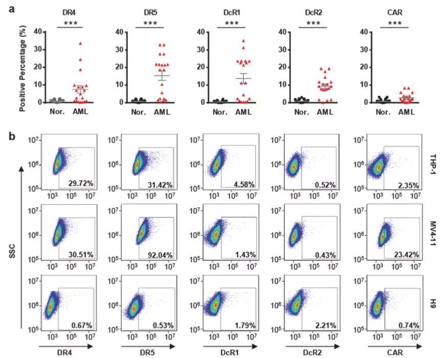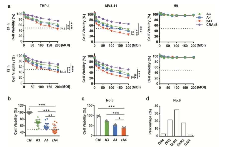 急性髓系白血病(AML)是髓系造血干细胞或祖细胞的恶性病变,原始细胞异常增生、分化。尽管通过一线治疗、巩固化疗方案能完全缓解很多患者的症状,然而还是有一部分患者没有明显的疗效,另外还有一些患者还有复发情况,因此亟需新的治疗方式。在之前的研究中,团队曾构建了一种表面展示肿瘤坏死因子相关凋亡诱导配体(TRAIL)的腺病毒,它能够结合肿瘤表面死亡受体DR4和DR5,诱导细胞凋亡,从而减弱病毒肝脏趋向性。为了更好地评估这种病毒载体的感染与复制造成的影响,团队通过流式细胞仪分析了病灶内分离的AML细胞上的腺病毒受体(CAR、整合素 αvβ3 和整合素αvβ5)和TRAIL受体(死亡受体DR4/5、诱饵受体DcR1/2),发现了多数表达中等水平TRAIL受体,培养细胞系也有类似现象,然而正常粒细胞、T细胞这两类受体表达却很低,因此,选择TRAIL表面展示腺病毒可以较好地进行靶向治疗。
