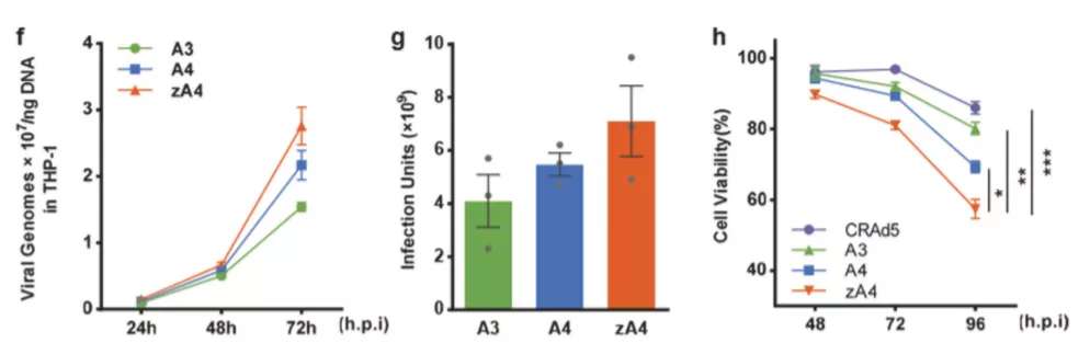 团队为构建溶瘤腺病毒,通过将腺病毒A3衣壳蛋白IX插入“拉链结构”,使得TRAIL能够与“拉链结构”偶联展示在衣壳蛋白表面。由于只有约17%的衣壳蛋白连接上了TRAIL,研究者试图采用新的策略:在大肠杆菌中表达可溶性TRAIL-“拉链结构”融合蛋白,再将可溶性的蛋白与病毒粒子孵育,离心后分离表面覆盖可溶性TRAIL的腺病毒粒子。通过变性凝胶电泳、高效液相色谱、斑点杂交等证实了改造的腺病毒zA4载有活性更高的TRAIL。细胞实验也证明zA4相较于原来的版本A3、A4侵染能力、特异性显著提高。细胞结合试验用于评估侵染活性,证明了携带TRAIL显著促进了腺病毒的内吞;定量PCR试验用于评估病毒复制能力,zA4在癌细胞中复制显著强于其他载体。
