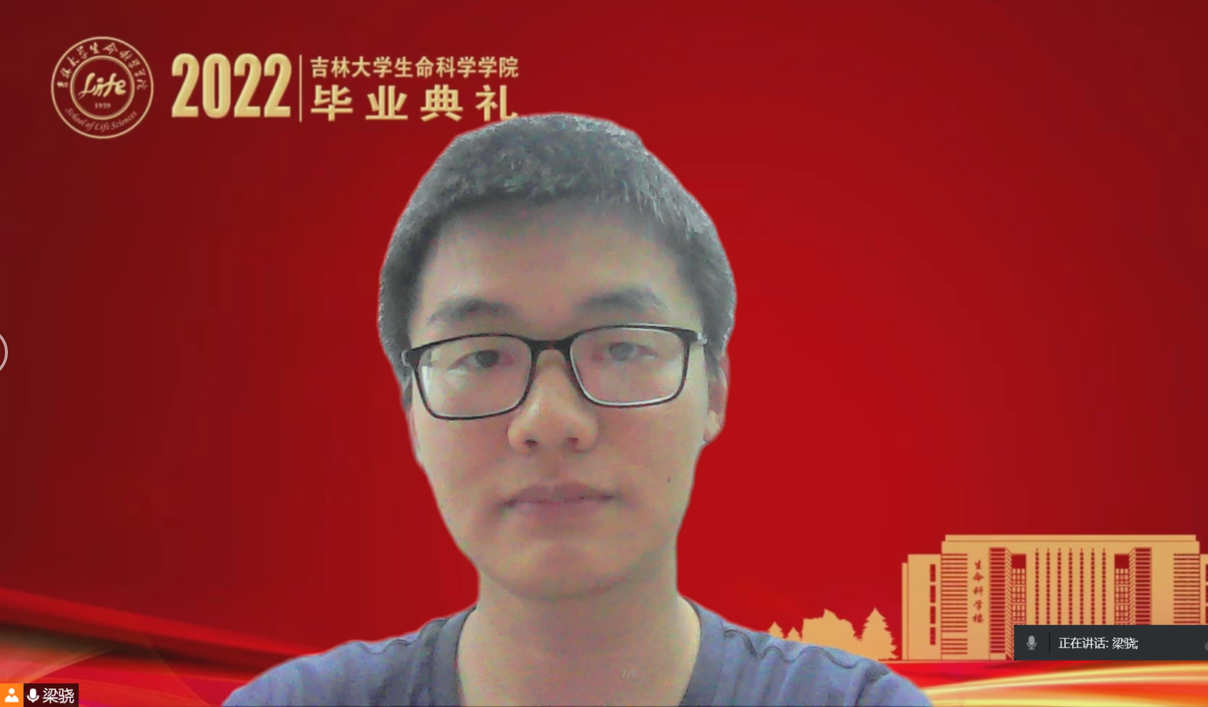 毕业研究生代表梁骁回顾了在吉林大学追逐梦想的九年历程,他表示,自从走进吉林大学这所知识的殿堂,“求实创新、立志图强”的吉大精神便深深地刻进了基因,成为了自身追求卓越、勇攀高峰的不竭动力。未来也将继续秉承吉大精神,弘扬生科传统,潜精研思、踔厉奋发,在个人成长与国家发展的同频共振中勇担科技报国使命,在建设社会主义现代化强国的伟大事业中贡献青春力量!