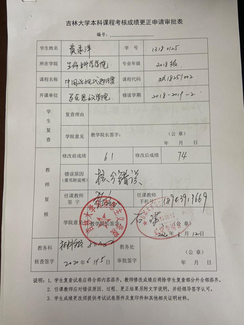 2018级黄录洋同学(学号:13180125)2019-2020-2学期课程成绩更正如下: