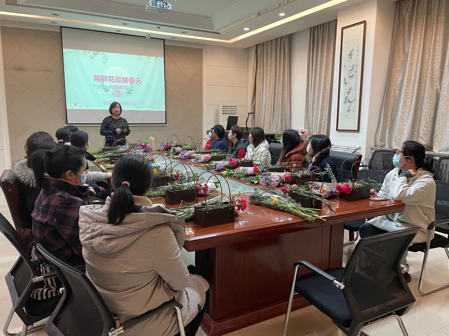 然后,特邀吉林省经济管理干部学院园林专业教师、高级花卉园艺师、中国插花花艺协会会员、长春市现代女性大讲堂高校巡讲团特聘讲师刘春博老师,为大家讲授插花的历史、传统插花和现代插花的特点,详细讲解了插花的要领及技法,并现场进行了插花演示。在刘老师的指导下,女教工们精心构思,认真修剪,以高涨的热情投入到插花创作,设计出一件件匠心独运的佳作。