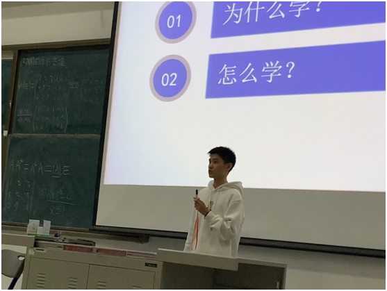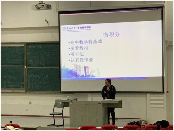 接下来由2019级生物科学类1班的李佳澎同学,为新生具体讲解微积分、医用大学物理、无机化学C、植物生物学四科的学习方法,同时也就如何平衡学习与工作及其他活动之间的关系做了详细的解答。