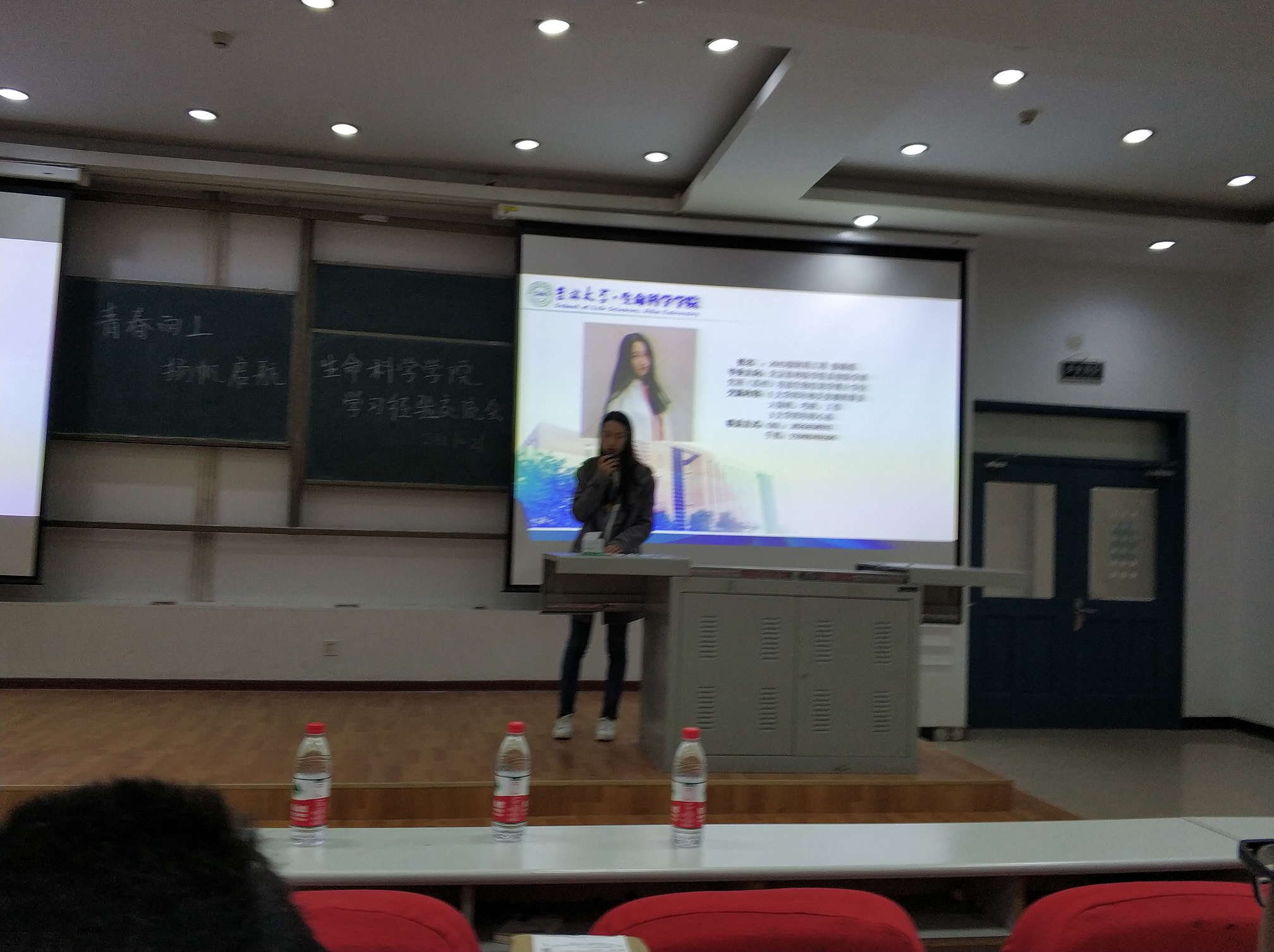 接下来由16级生物制药3班赵小豫学姐发言。赵学姐从自己的亲身经历出发,给大家讲解大学常碰到的雷区,用幽默的语言告诫大家要养成良好的学习习惯,注重平时的积累,保持紧张感。同时学姐留下了自己的联系方式表示愿意将自己的学习资料分享给大家,在学习上为大家提供帮助。